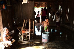 This intimate photograph captures a moment in a rustic dwelling, where a young boy stands playfully with a green cup beside a water bucket, embodying the spirit of childhood amidst humble living conditions. The warm, natural light filters through the wooden slats, casting dynamic shadows and creating a sense of warmth and community as other figures blend into the background. The calm water reflects their simple yet lively existence, inviting viewers into their world of resilience and innocence.