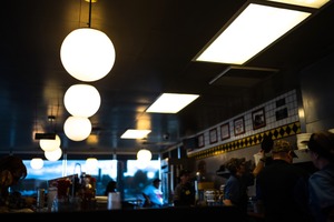 This photograph captures the bustling ambiance of a diner at twilight, illuminated by soft, glowing orbs and stark fluorescent lights. The warm yet subdued lighting creates a cozy contrast against the fading daylight outside, enhancing the lively activity behind the counter where staff are engaged in their evening routines. Shadows and silhouettes add depth to the composition, evoking a sense of nostalgia and comfort in this familiar setting.