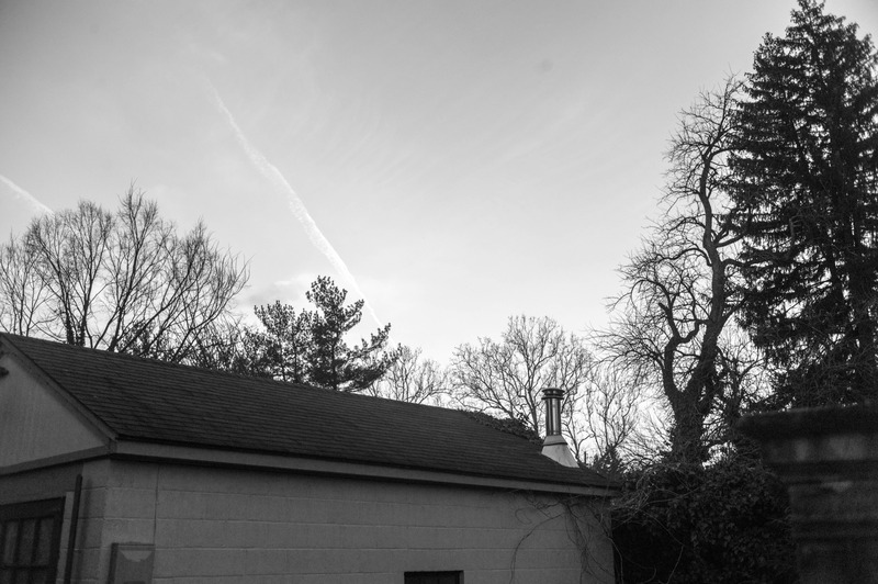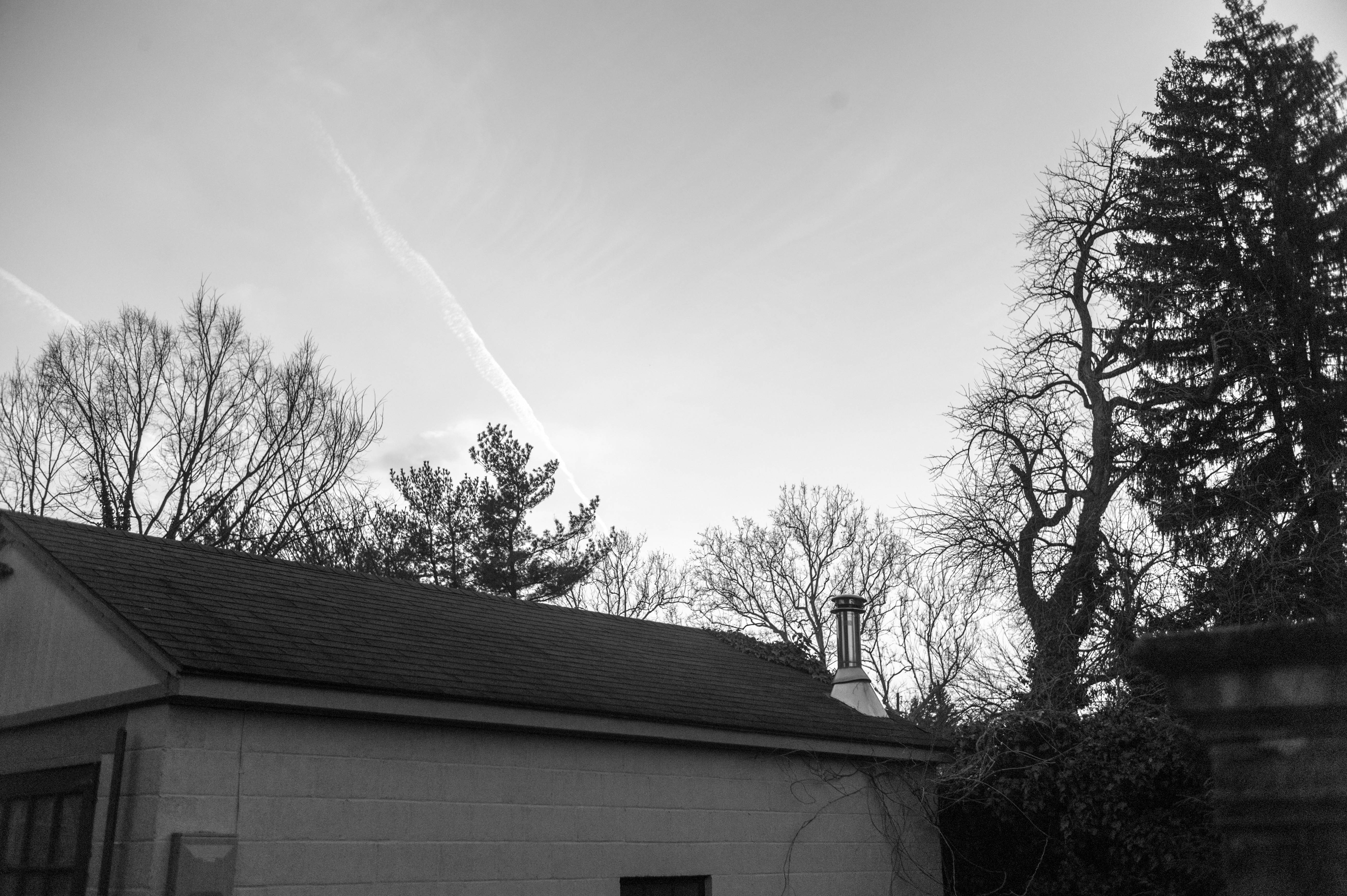 The photograph captures a serene scene of a backyard, showcasing a muted gray sky strewn with delicate wisps of clouds. In the foreground, a modest building contrasts with the bare silhouettes of winter trees, creating a sense of stillness and solitude. The overall mood is tranquil, enhanced by the soft, diffused light that envelops the landscape.