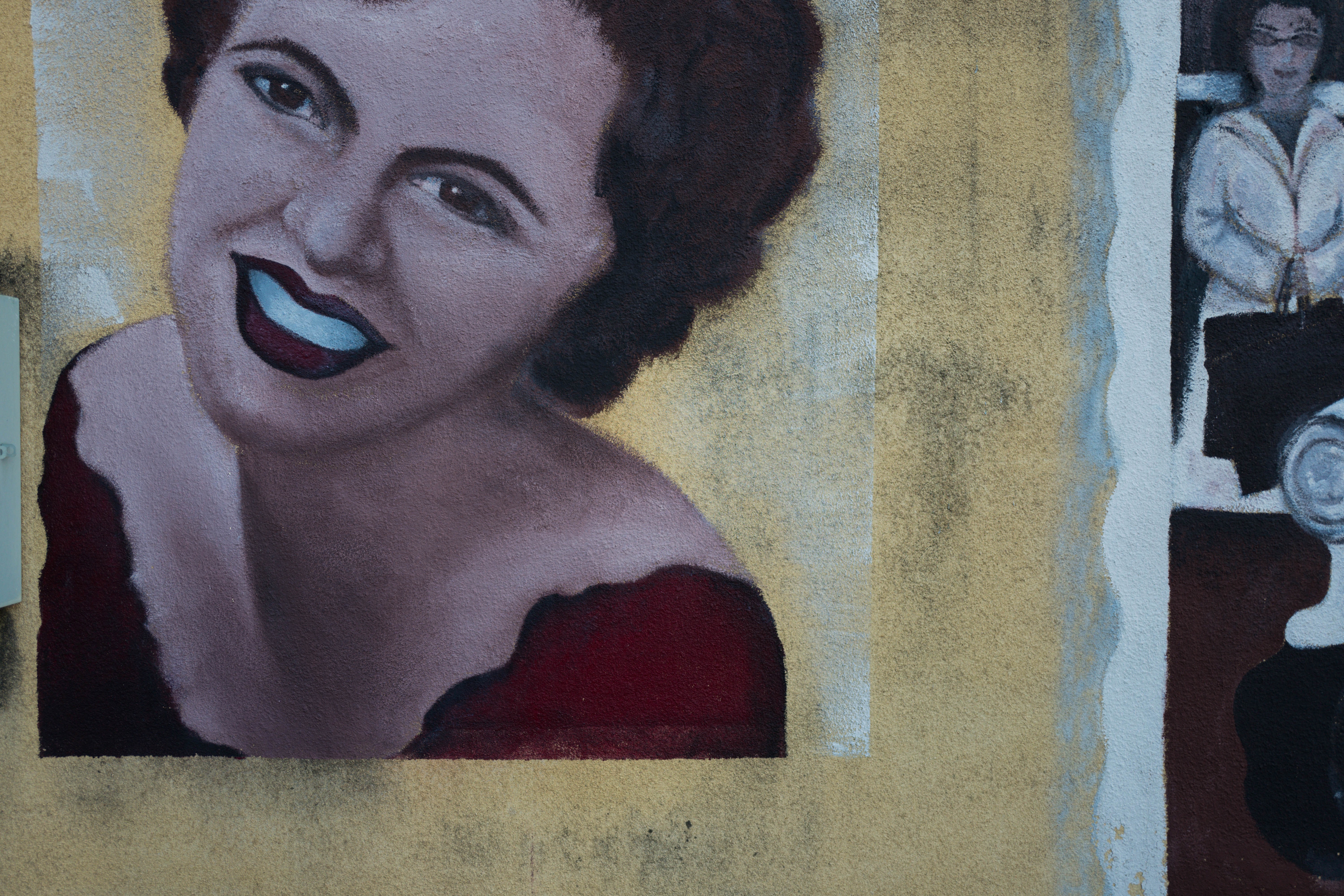 This striking mural features a smiling woman with dark curly hair and bright lipstick, capturing a moment of joy against a soft, sepia-toned background. The warm lighting and vivid colors evoke nostalgia, inviting the viewer into a bygone era. The composition leads the eye towards her cheerful expression, making the mural a captivating focal point in its surroundings.