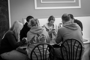 In a cozy café setting, a group of individuals sit around a table, absorbed in their devices rather than engaging with each other. The muted lighting and monochrome tones evoke a sense of introspection and isolation despite their physical proximity. This composition highlights the contrast between the warmth of the space and the coldness of digital distractions.