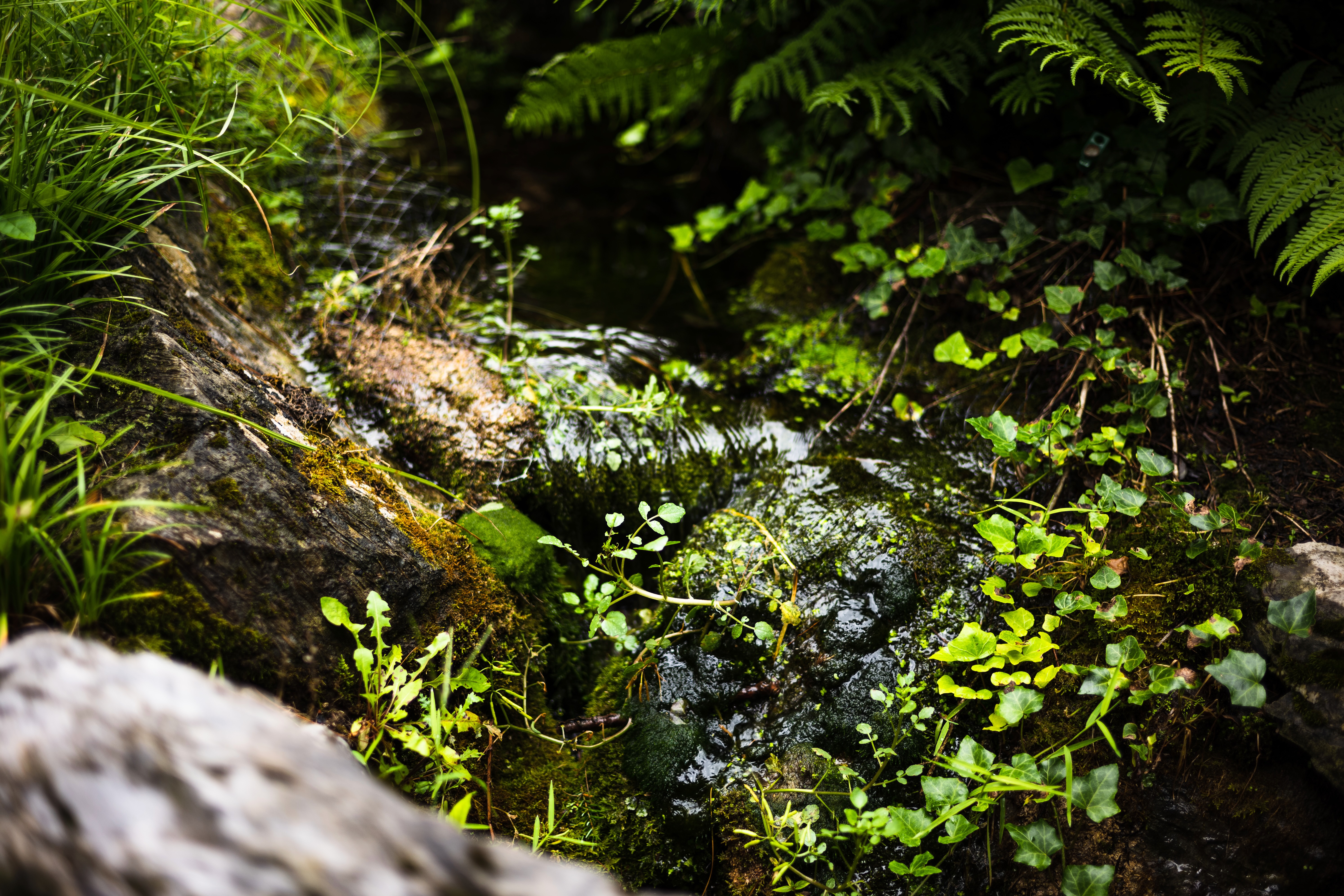This photograph captures a tranquil stream winding through a lush forest floor. Shimmering water reflects the dappled sunlight, illuminating vibrant greens and rich textures of mossy rocks and delicate plants. The overall mood is peaceful and rejuvenating, inviting a sense of calm and connection with nature.