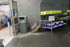 A vibrant rainbow umbrella leans against a dull gray wall, contrasting sharply with the muted tones of the surrounding environment. The mood feels oddly melancholic yet whimsical, as the freshly watered plants in colorful pots stand nearby, hinting at life amidst the dreariness. The dim lighting casts soft shadows, enveloping the scene in a quiet, reflective atmosphere.