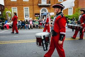 The photograph captures a lively parade scene, showcasing a group of synchronized drummers dressed in striking red uniforms. The crowd watches with anticipation, while a cool, overcast sky casts a muted yet vibrant light over the performers, enhancing the rhythm and camaraderie of the event. The composition balances the performers in the foreground with onlookers in the background, creating a dynamic sense of movement and celebration.