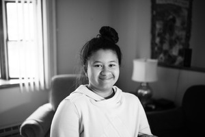 In this black and white portrait, a young girl sits comfortably, exuding a warm and inviting smile. Natural light filters in through a nearby window, casting soft shadows that enhance the cozy atmosphere of the room. The thoughtful composition draws attention to her expressiveness, juxtaposed against the tranquil backdrop of home furnishings.