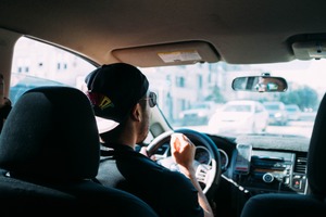 The photograph captures a young driver immersed in the act of navigating through bustling city streets. Warm sunlight filters in, casting a bright glow that enhances the sense of adventure and spontaneity. The intimate framing, focusing on the driver's silhouette and hands on the wheel, emphasizes a feeling of connection to the vibrant life outside the car window.