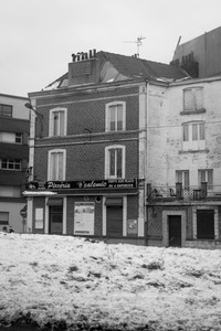This monochrome photograph captures a quaint pizzeria, ‘O Salenio,’ nestled within a weathered building. The somber mood is enhanced by the blanket of snow that obscures the ground, while muted lighting suggests a chilly, overcast day. The contrasting textures of the brick facade and the neighboring buildings create an evocative sense of nostalgia and quiet isolation.