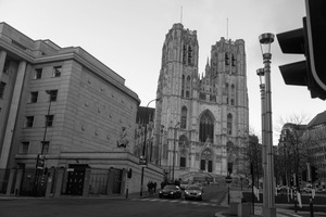 The photograph features a striking Gothic cathedral juxtaposed against modern architecture, capturing the essence of historical grandeur amid contemporary life. The stark black and white palette enhances the drama, emphasizing the intricate details of the cathedral's facade while casting long shadows that evoke a sense of mystery. The composition draws the viewer’s eye upward, suggesting both reverence and a connection to the past.