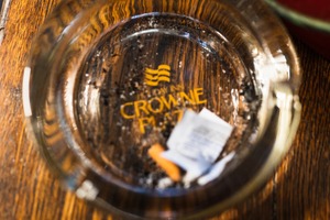 The photograph captures a close-up of a glass ashtray, its curved surface showcasing remnants of ashes and a discarded cigarette. The warm wood grain beneath adds a nostalgic touch, while the ambient lighting highlights the simplicity and wear of the scene. This tableau evokes a sense of quiet reflection, hinting at stories of moments shared and solitary contemplation.