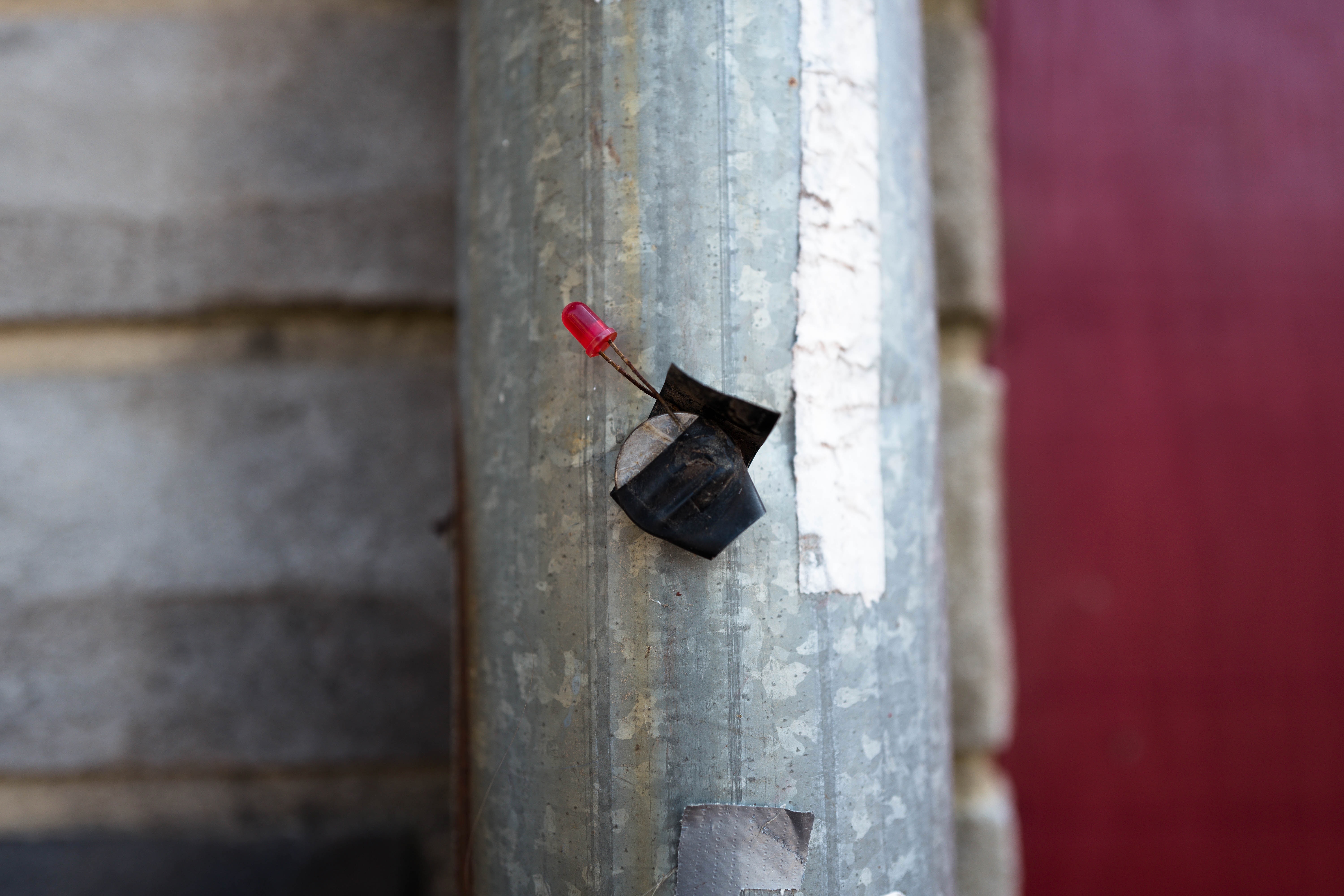 A close-up of a textured, metallic pole showcases a small, makeshift patch—black and irregular—where a vibrant red LED light clings precariously. The composition draws attention to this unexpected blend of industrial materials, juxtaposing man-made with the aging backdrop. Soft, natural light highlights the pole’s imperfections while casting subtle shadows, creating a mood of quiet resilience and fleeting beauty in an urban setting.