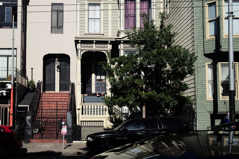 This photograph captures a charming street scene, showcasing a juxtaposition of ornate and simple architectural styles. The warm afternoon light bathes the buildings, accentuating their textured surfaces and highlighting the vibrant greenery of the tree. With a serene atmosphere, the composition invites contemplation of urban life and the stories behind these homes.