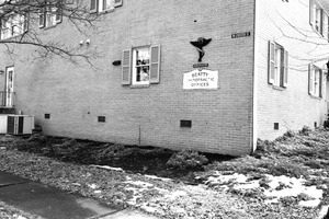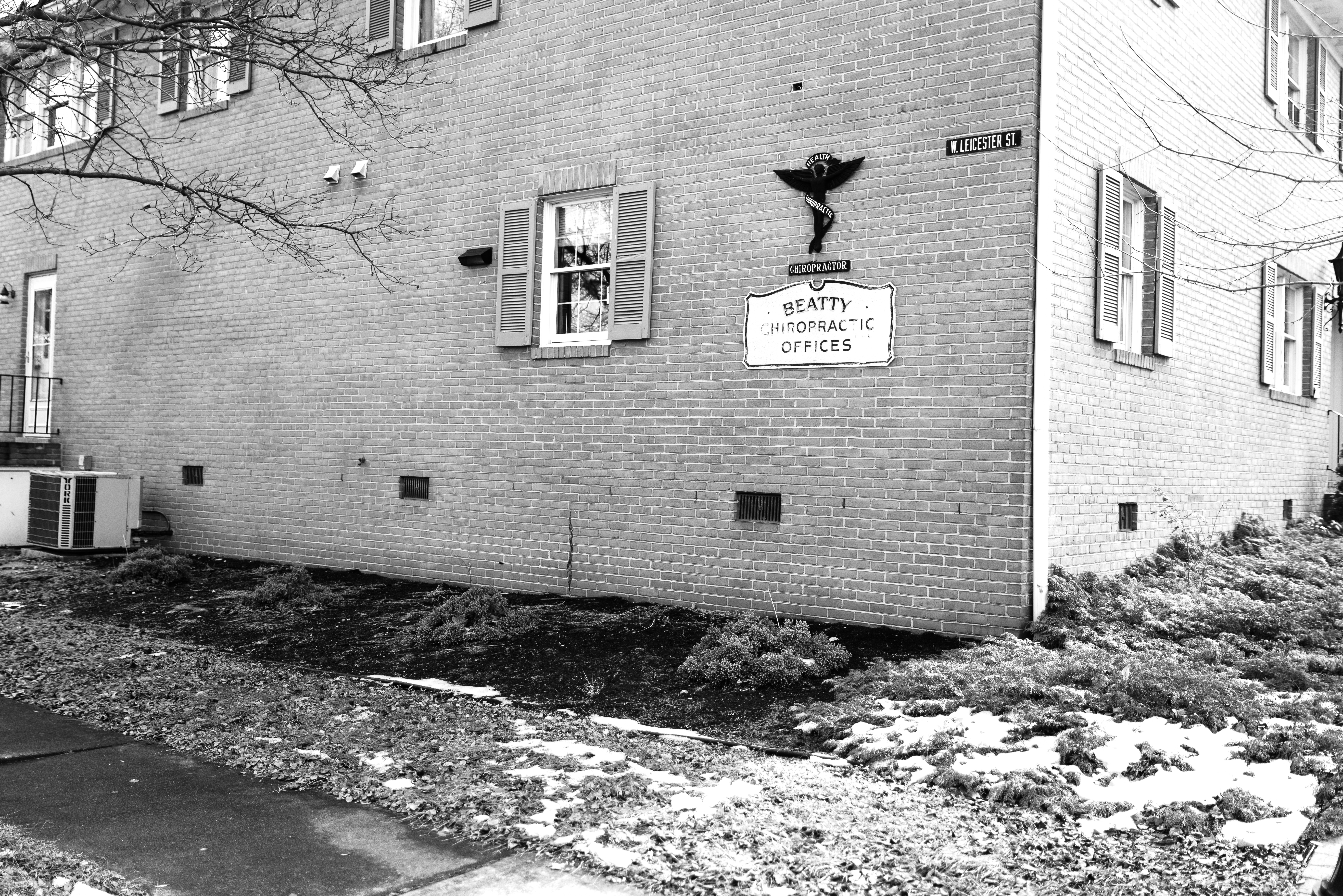 This photograph captures a tranquil corner of a brick building housing a chiropractic office, emphasizing the rhythmic lines of the architecture. The black-and-white palette adds a sense of nostalgia, enhancing the serene mood, while sparse patches of snow hint at the season. The composition is anchored by the prominent sign, framing the quiet street and inviting viewers to reflect on the ordinary yet significant moments of daily life.