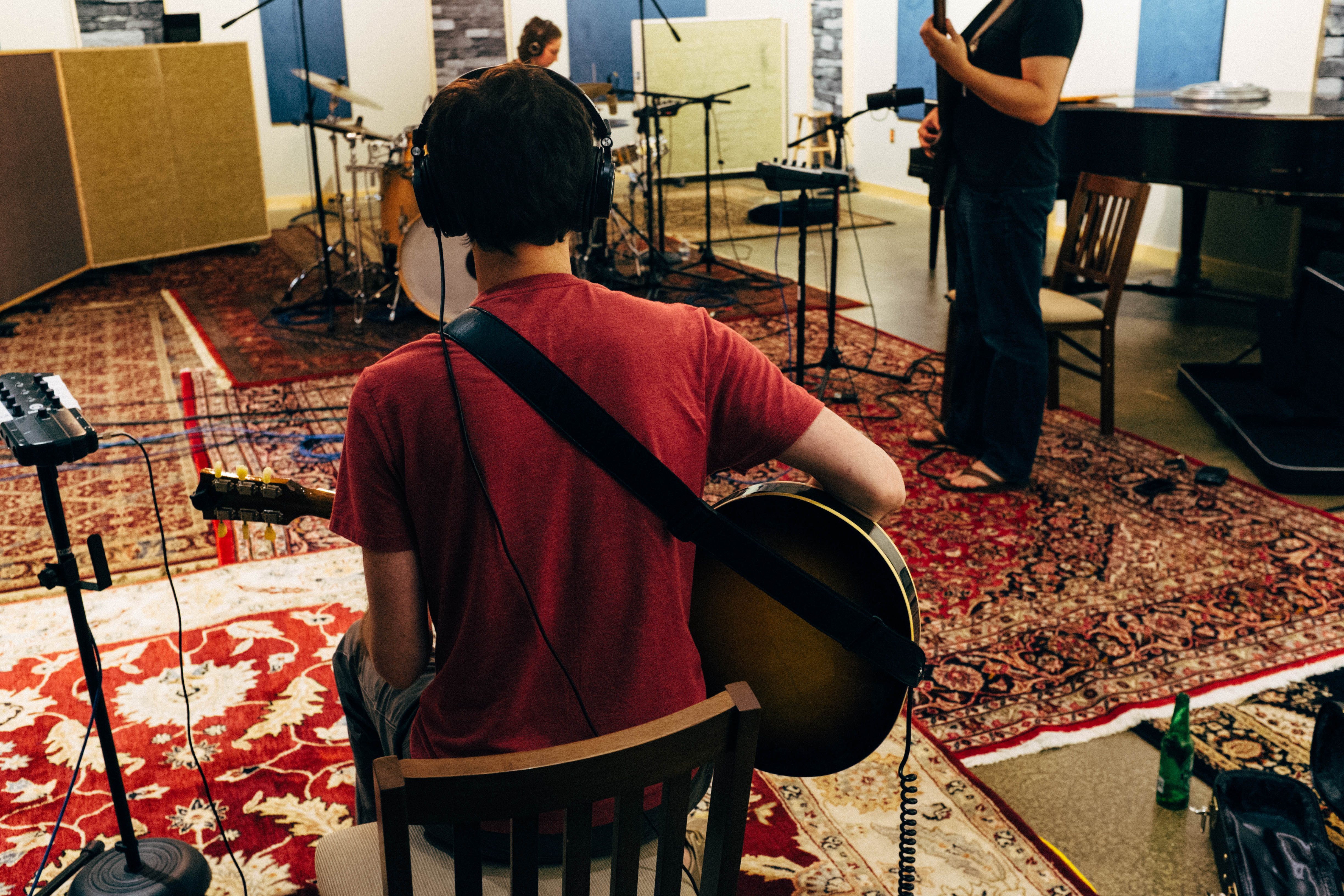 This photograph captures a musician seated in a cozy recording studio, his back turned as he strums an acoustic guitar. The warm lighting and rich textures of the rugs and instruments create an intimate atmosphere, while the presence of other musicians suggests a collaborative and creative energy. The composition draws the eye from the focused musician to the collaborative scene unfolding around him, evoking a sense of musical exploration.