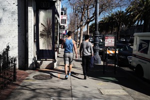 Two figures walk leisurely down a sunlit sidewalk, captured in a moment that exudes ease and camaraderie. The composition highlights the bustling urban environment, framed by palm trees and storefronts, while the warm light casts sharp shadows, creating a vibrant yet relaxed mood. Their casual attire suggests a comfortable day, beckoning a sense of freedom amid the city life.