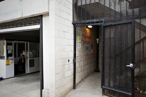 A glimpse into a semi-enclosed space, the photograph captures the stark contrast between the institutional setting and the urban feel of the entrance. Dim lighting casts shadows, enhancing the feeling of isolation, while the graffiti and signage hint at a forgotten vibrancy. The composition draws the eye from the attendant's booth to the open gate, inviting contemplation about what lies beyond.