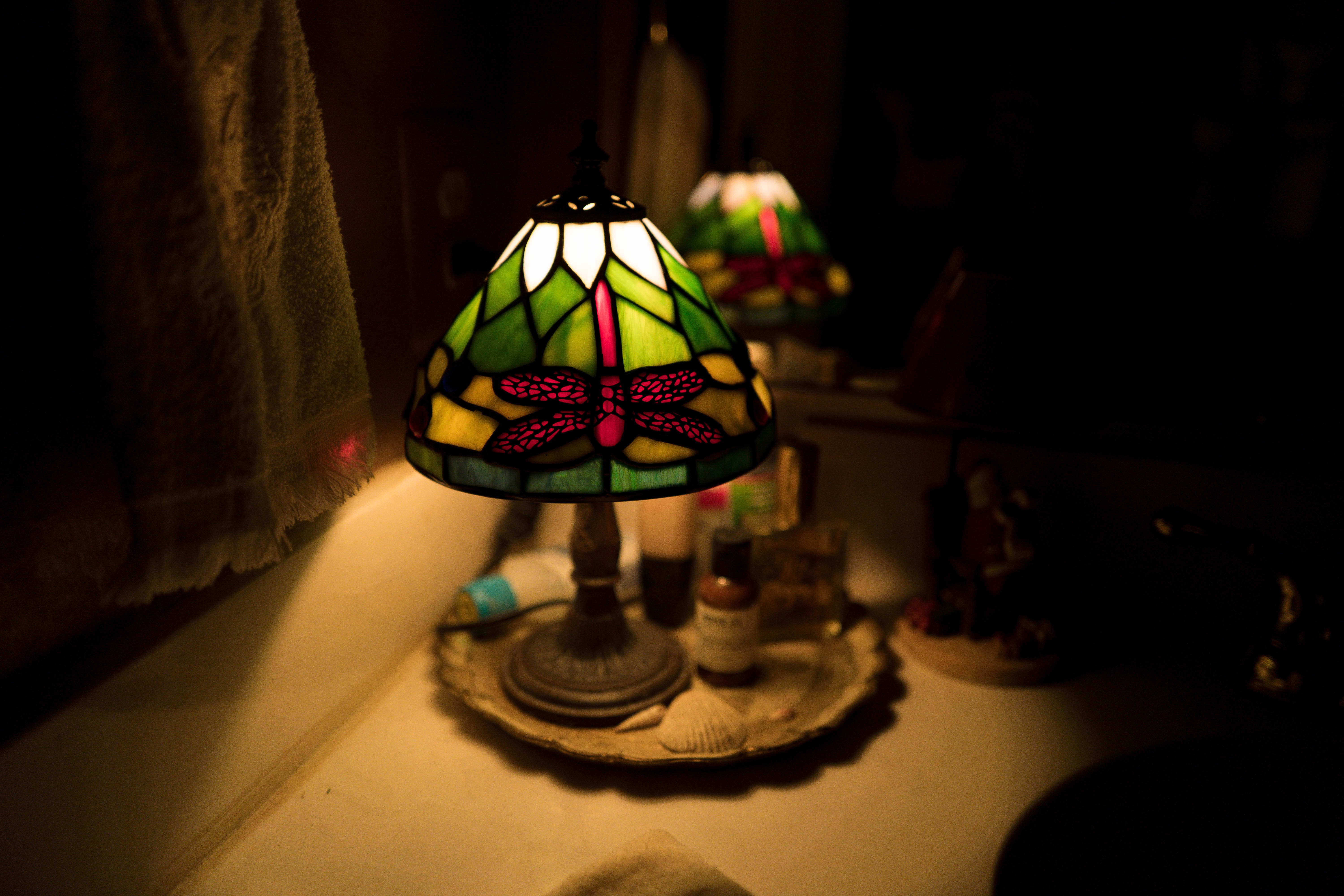 A stained-glass lamp casts a warm, inviting glow in a dim sanctuary, highlighting its intricate dragonfly design. The soft light contrasts beautifully with the surrounding shadows, creating an intimate and contemplative mood. Reflections in the polished surface evoke a sense of tranquility, as if time stands still in this personal space.