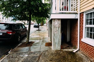 This photograph captures a quiet, rainy street scene where vibrant chalk flowers contrast against the muted gray of wet pavement and brick walls. The composition draws the eye along the sidewalk, revealing a sense of urban life softened by the lush green of trees and cozy details like the overhanging balcony. The diffuse lighting enhances the mood of serene introspection, inviting viewers to appreciate the small joys of everyday surroundings.