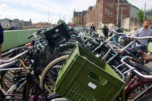 A vibrant collage of bicycles fills the frame, their varied shapes and colors creating a dynamic sense of chaos. The composition hints at urban life, with pedestrians moving confidently in the background amidst a sunny, bright day. The soft, natural light enhances the scene's energetic mood, reflecting a bustling city atmosphere.