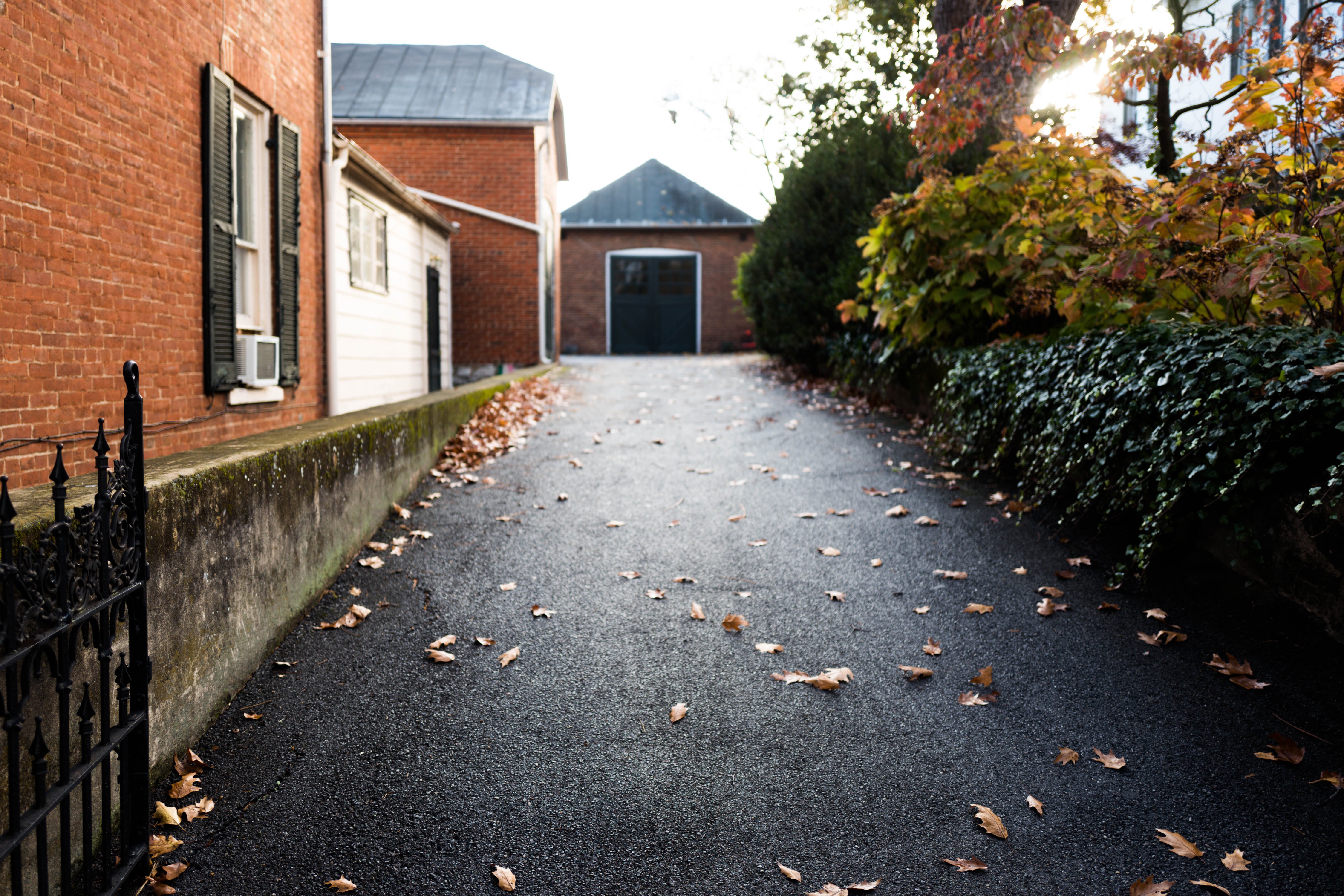 A narrow, leaf-strewn driveway dappled with soft morning light leads the viewer's gaze toward a distant, unobtrusive building. The warm hues of the brick facades contrast with the cool asphalt, creating a serene and slightly nostalgic atmosphere. The composition is peaceful, framed by lush greenery and the faint hint of an awakening day.