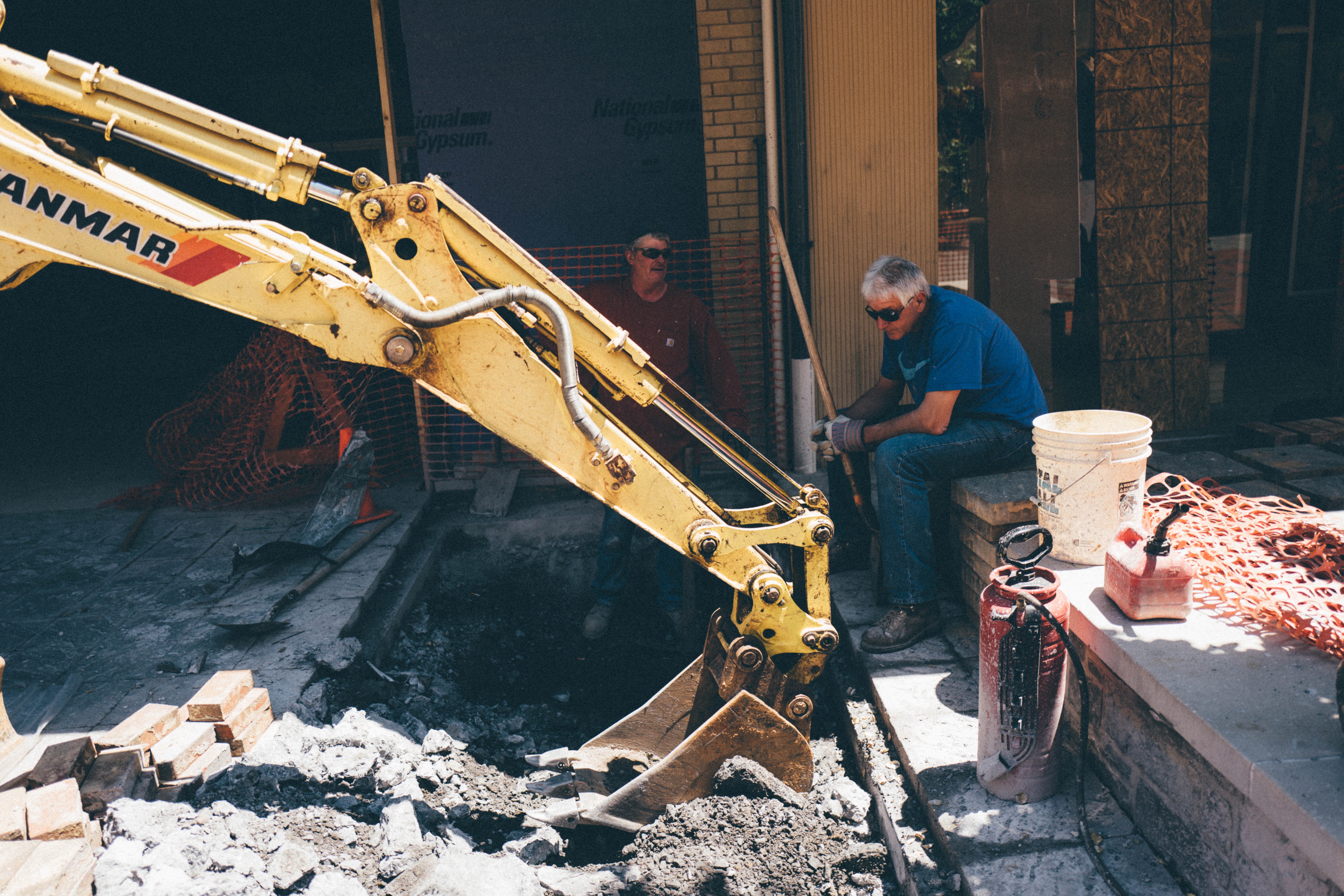 This photograph captures a moment on a construction site, where two workers, one seated and the other standing, engage in their tasks amidst a scene of disruption and excavation. The harsh daylight illuminates the gritty surroundings, highlighting the contrast between the heavy machinery and the human elements at play, creating a mood of industrious determination amid chaos.
