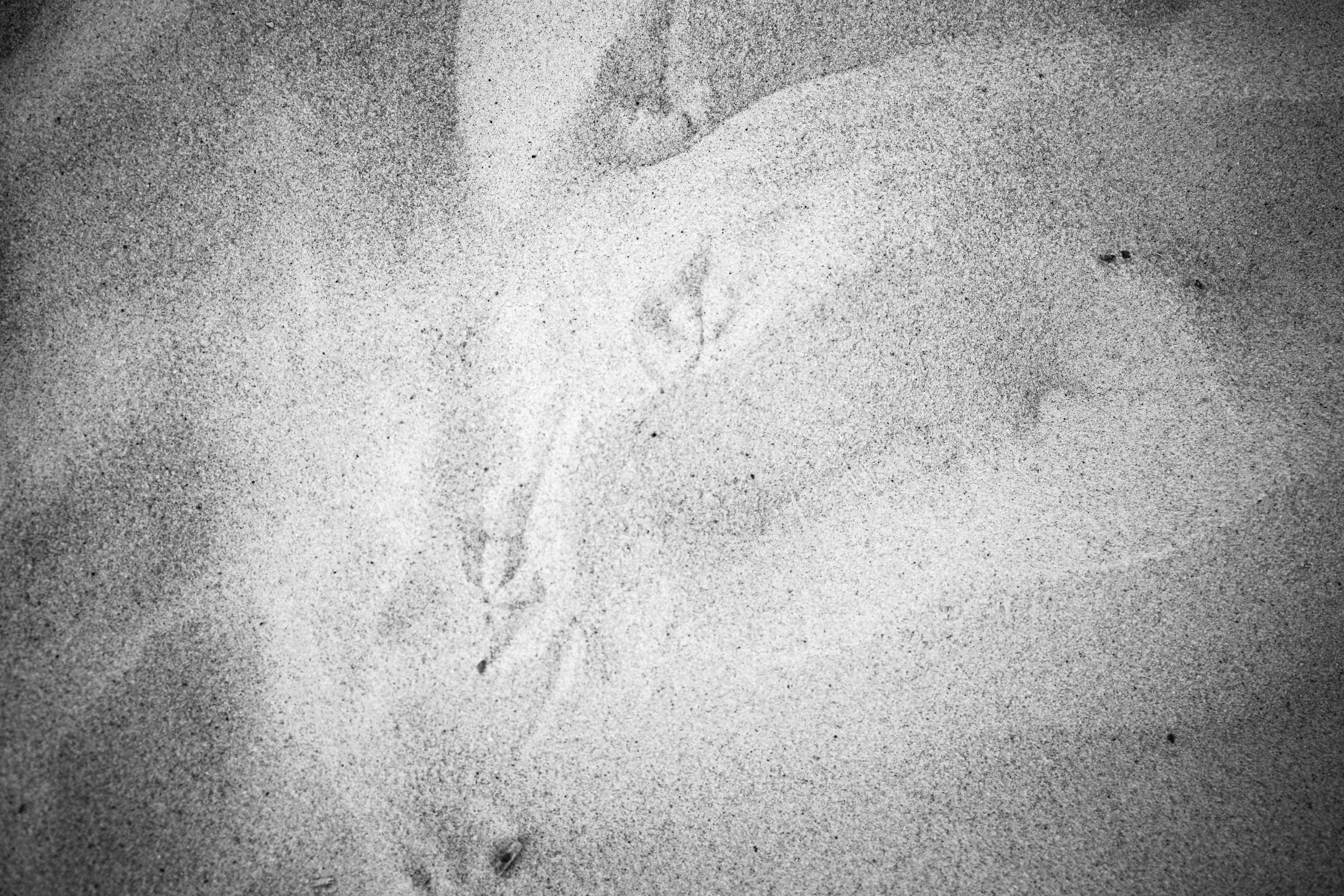 This monochromatic photograph captures delicate footprints in fine sand, evoking a sense of tranquility and solitude. The soft gradients and textures of the sand create a serene mood, while the blurred lines suggest movement and the passage of time. The composition's simplicity focuses attention on the small details, inviting contemplation of nature's quiet beauty.