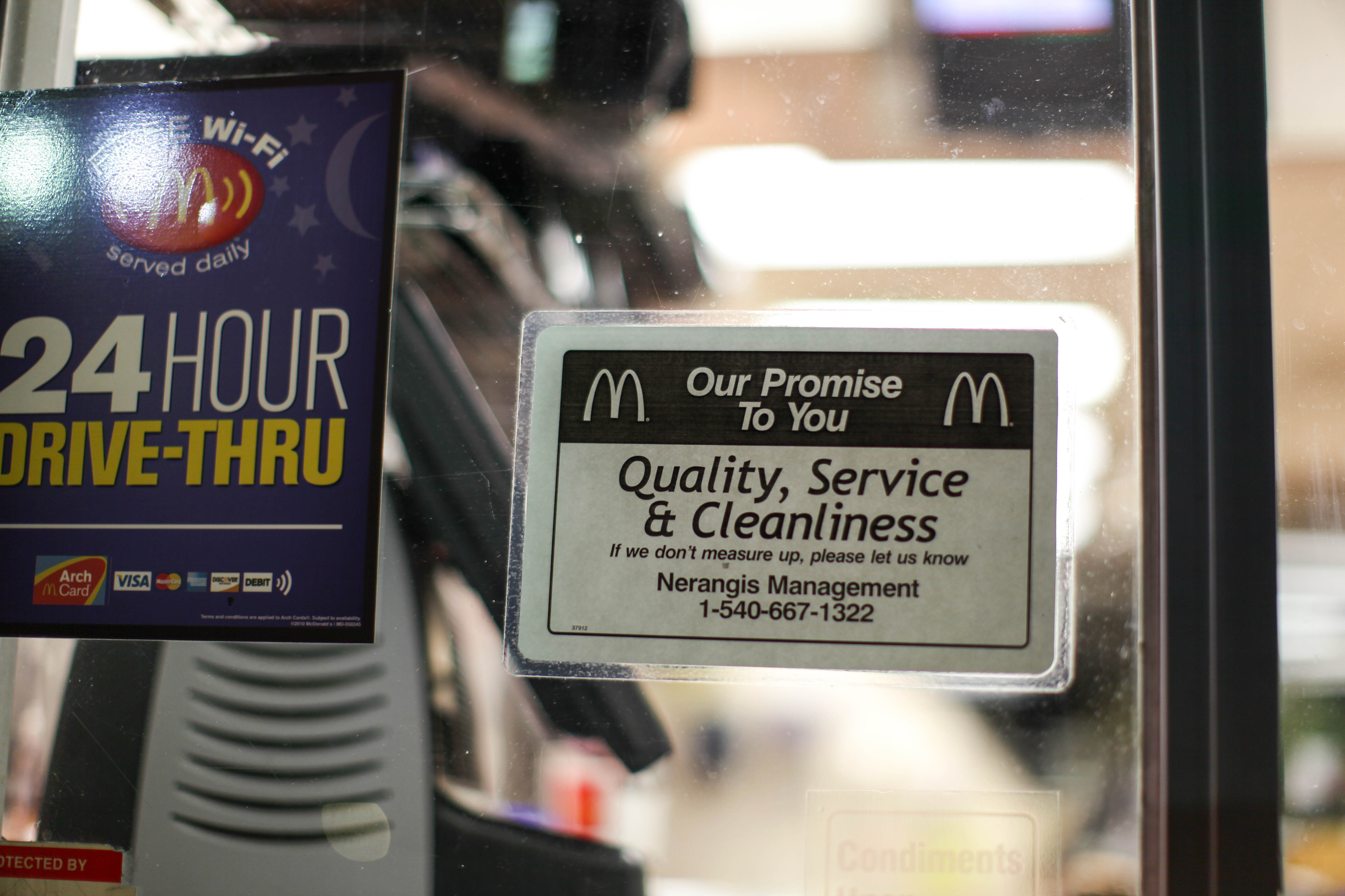 This photograph captures a close-up of McDonald's signage, reflecting a commitment to customer service and cleanliness. The muted lighting gives the scene a subdued, yet inviting mood, while the juxtaposition of official promises against the casual atmosphere of a drive-thru creates an interesting tension. The composition focuses on the signs, emphasizing the brand’s message of dependability and warmth in late-night service.