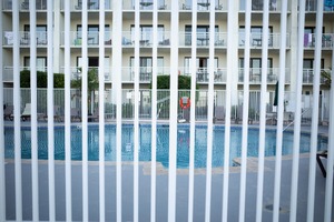 This photograph captures a tranquil swimming pool scene, framed by stark white railings that create a sense of confinement. The soft blue water reflects the muted sunlight, evoking a serene yet slightly isolating atmosphere. The orderly composition, with its vertical lines, contrasts the inviting pool, hinting at a place where relaxation is juxtaposed with barriers.