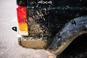 The photograph captures the rugged rear of a muddy 4x4 vehicle, evoking a sense of adventure and exploration. Sunlight glints off the surfaces, highlighting the textures of the dirt and metal, while the warm hues of the taillights contrast with the dark, gritty backdrop. This composition speaks to the thrill of off-road journeys and the stories etched into every scratch and mark.