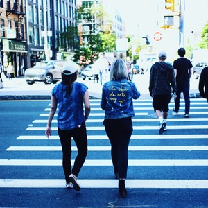In this vibrant street scene, two women stroll casually across a busy crosswalk, showcasing their distinct denim jackets. The bright lighting enhances the lively atmosphere, while the contrast between the blue sky and urban backdrop adds depth. A blend of pedestrians in motion creates a dynamic composition, reflecting the pulse of city life.