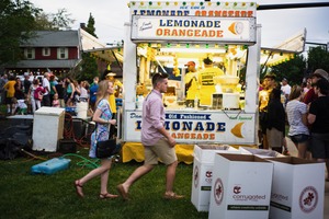 Captured in a lively outdoor festival, the photograph focuses on a colorful lemonade stand bustling with patrons. The warm, inviting lights create a festive atmosphere, highlighting the joy and anticipation of summer flavors. A young couple is featured in the foreground, adding a touch of casual charm amidst the vibrant crowd behind them.