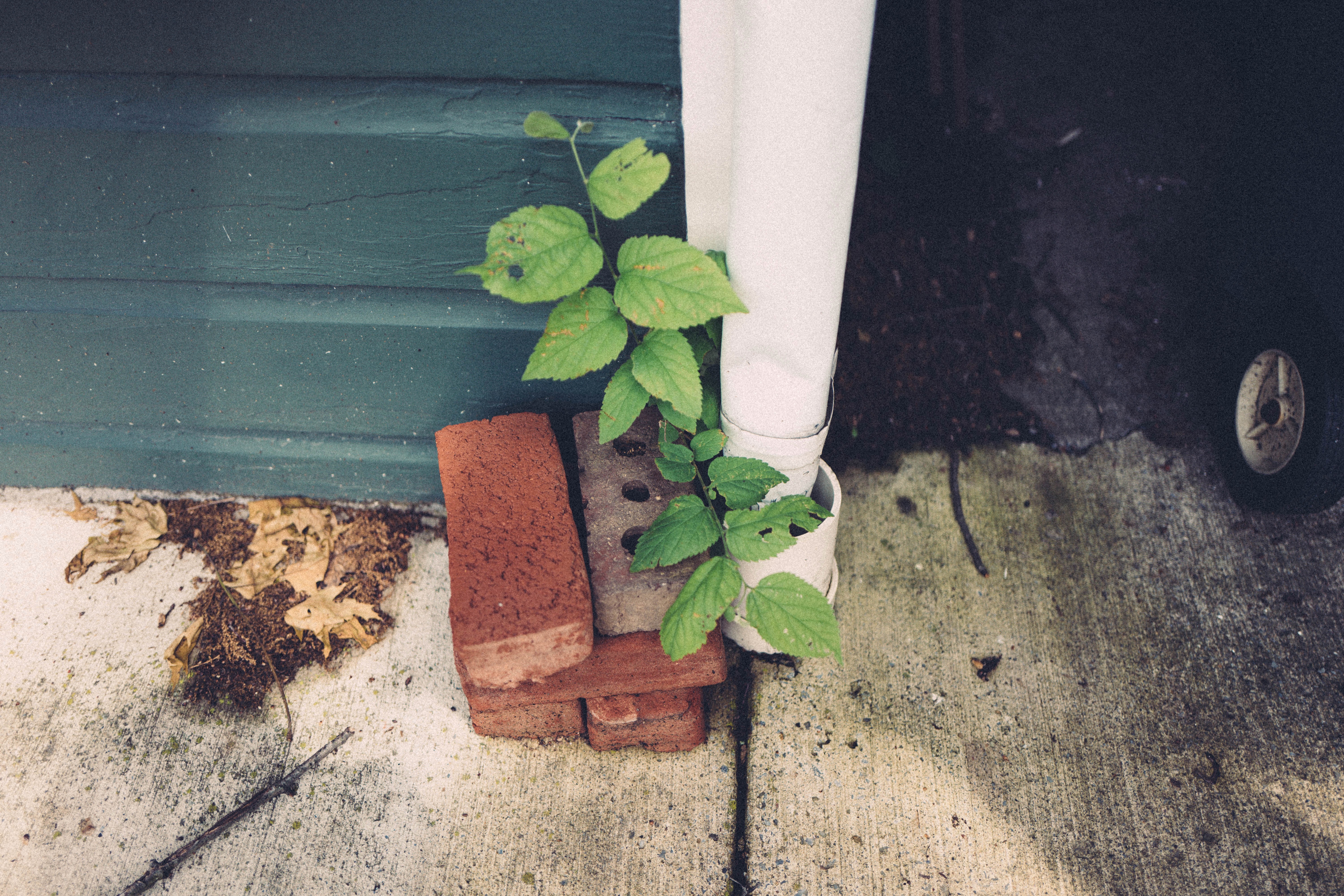Amidst a clutter of bricks and concrete, a vibrant green plant pushes through, symbolizing resilience and tenacity. The soft, natural lighting casts gentle shadows that draw attention to the contrasting textures of the materials surrounding the plant. This composition evokes a sense of hope and the unexpected beauty found in overlooked corners of everyday life.