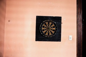 A solitary dartboard, mounted on a faded wall, creates a sense of quiet nostalgia. The warm peach tones of the wall contrast with the dark, worn surface of the board, evoking a mood of both familiarity and melancholy. Subtle lighting enhances the textures, hinting at stories of laughter and friendly competition long past.