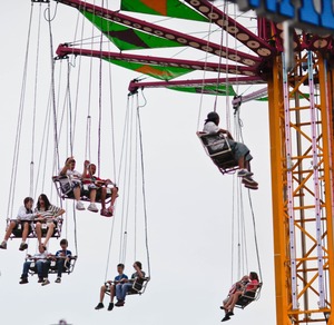A series of swing chairs dangle from a vibrant amusement ride, capturing the joy and thrill of carnival excitement. The mood is lighthearted, with the participants' expressions reflecting a mix of exhilaration and camaraderie. Soft, diffused lighting enhances the cheerful atmosphere, making the colorful rigging and the cloudy sky pop against the backdrop of youthful adventure.