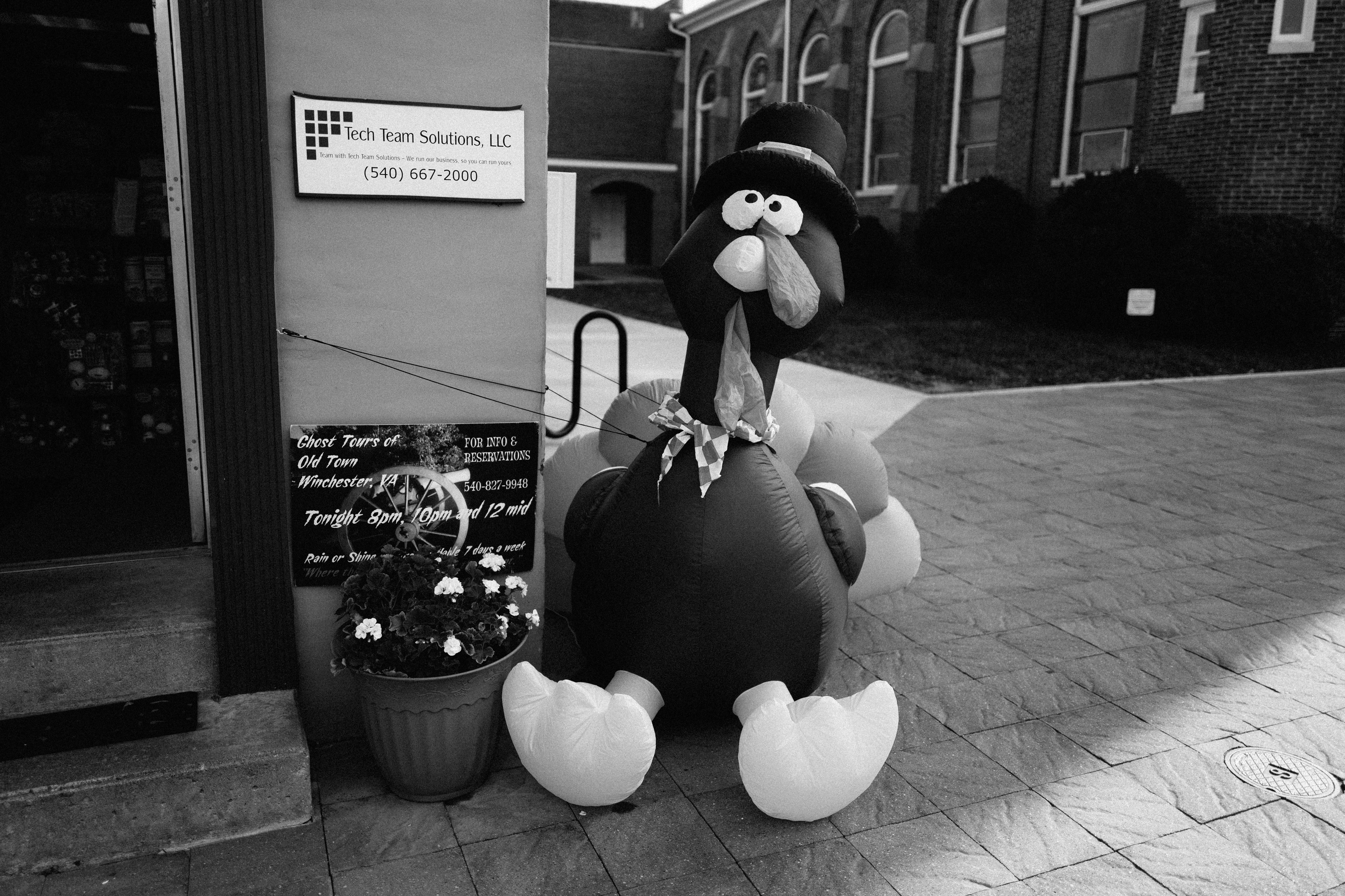 The photograph showcases a whimsical inflatable turkey perched next to a storefront, embodying the playful spirit of autumn festivities. The black-and-white composition emphasizes the contrast between the turkey's cheerful form and the more serious backdrop of the building, creating a light-hearted mood. Subtle shadows stretch across the pavement, adding depth to the scene while enhancing the sense of seasonal transition.
