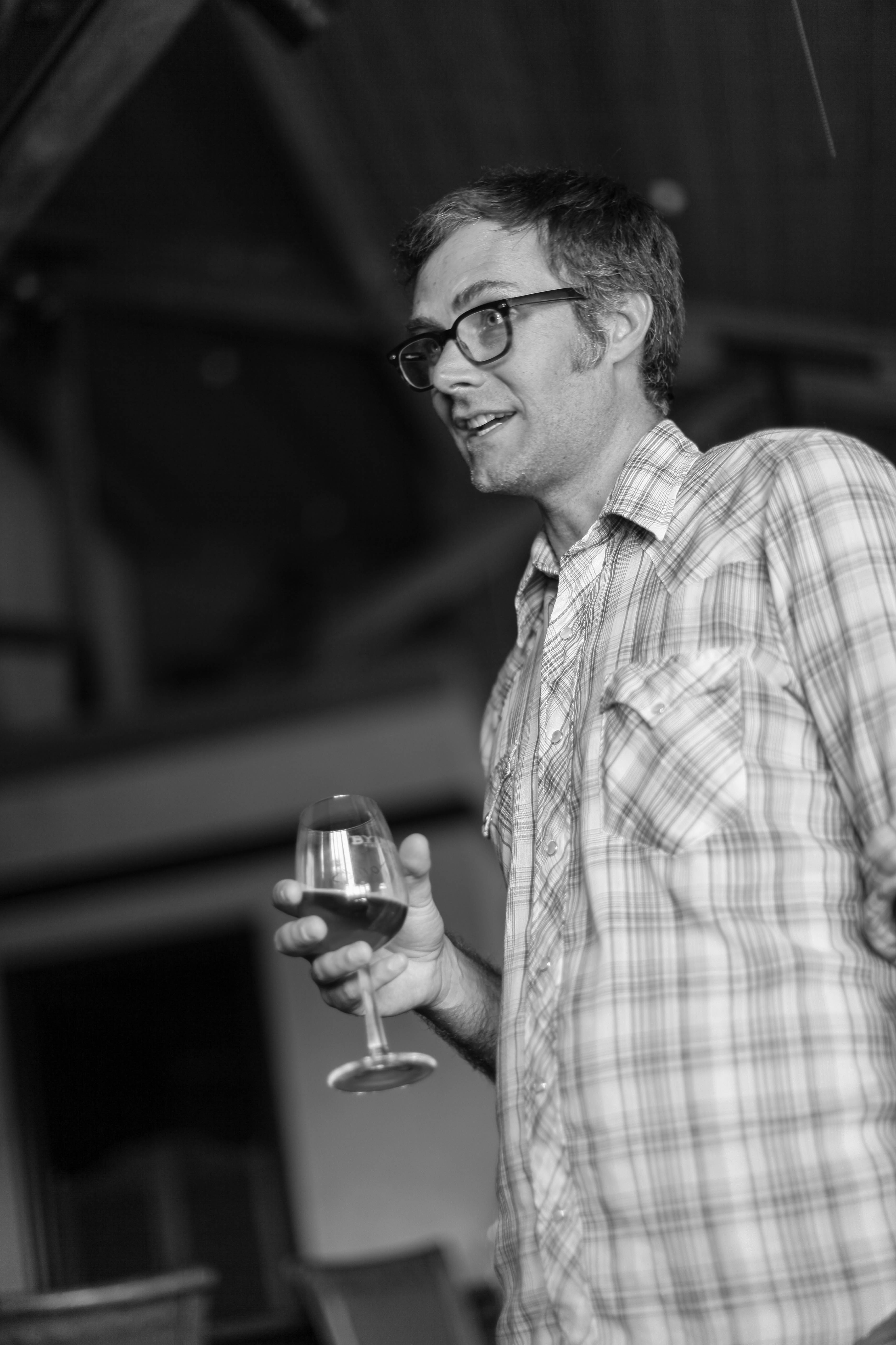 In this monochrome photograph, a man in glasses and a plaid shirt engages animatedly while holding a glass of wine. The soft lighting highlights his expressive demeanor, evoking a warm and inviting atmosphere. The blurred background accentuates the warmth of the moment, drawing focus to his animated pose and cheerful expression.