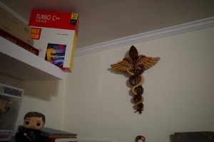 A wooden Caduceus symbol, with its intricately carved wings and serpents, dominates the corner of a cozy room. The warm, muted lighting casts a gentle glow, creating a serene mood amidst the clutter of books and nostalgic items below. This unexpected blend of medical symbolism and retro tech evokes a sense of history and personal significance.