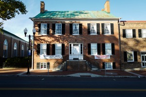 A stately brick building stands prominently, adorned with a green metal roof and black shutters that contrast sharply against the warm brick. Morning light bathes the facade, creating a serene atmosphere that invites contemplation. The presence of neighboring structures and signage hints at the vibrant community life that surrounds this historic landmark.