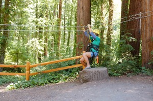 A young woman in a bright helmet prepares to zip line through a lush forest, her determined expression highlighting the thrill of adventure. Surrounded by towering redwoods and vibrant greenery, the warm sunlight filters through the leaves, casting an inviting glow. The composition captures both the anticipation of the moment and the serene beauty of nature, enhancing the feeling of freedom and excitement.