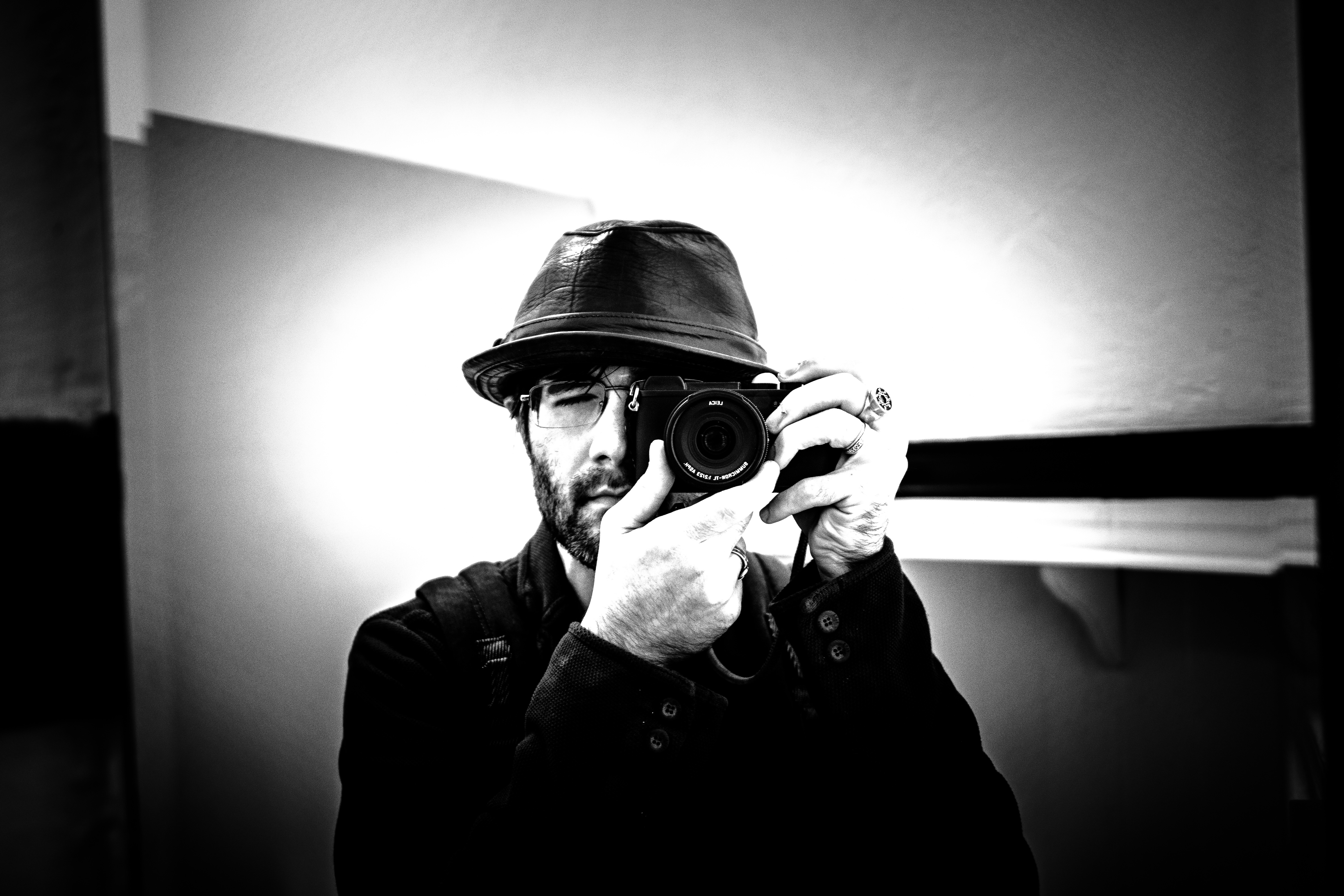 The photograph captures a contemplative self-portrait of a man with a camera, framed within a softly blurred, minimalist environment. The stark black and white contrast emphasizes his focused expression and the details of his hat and glasses, evoking a mood of introspection and creativity. The lighting subtly illuminates his face, drawing attention to his intent gaze as he immortalizes the moment.