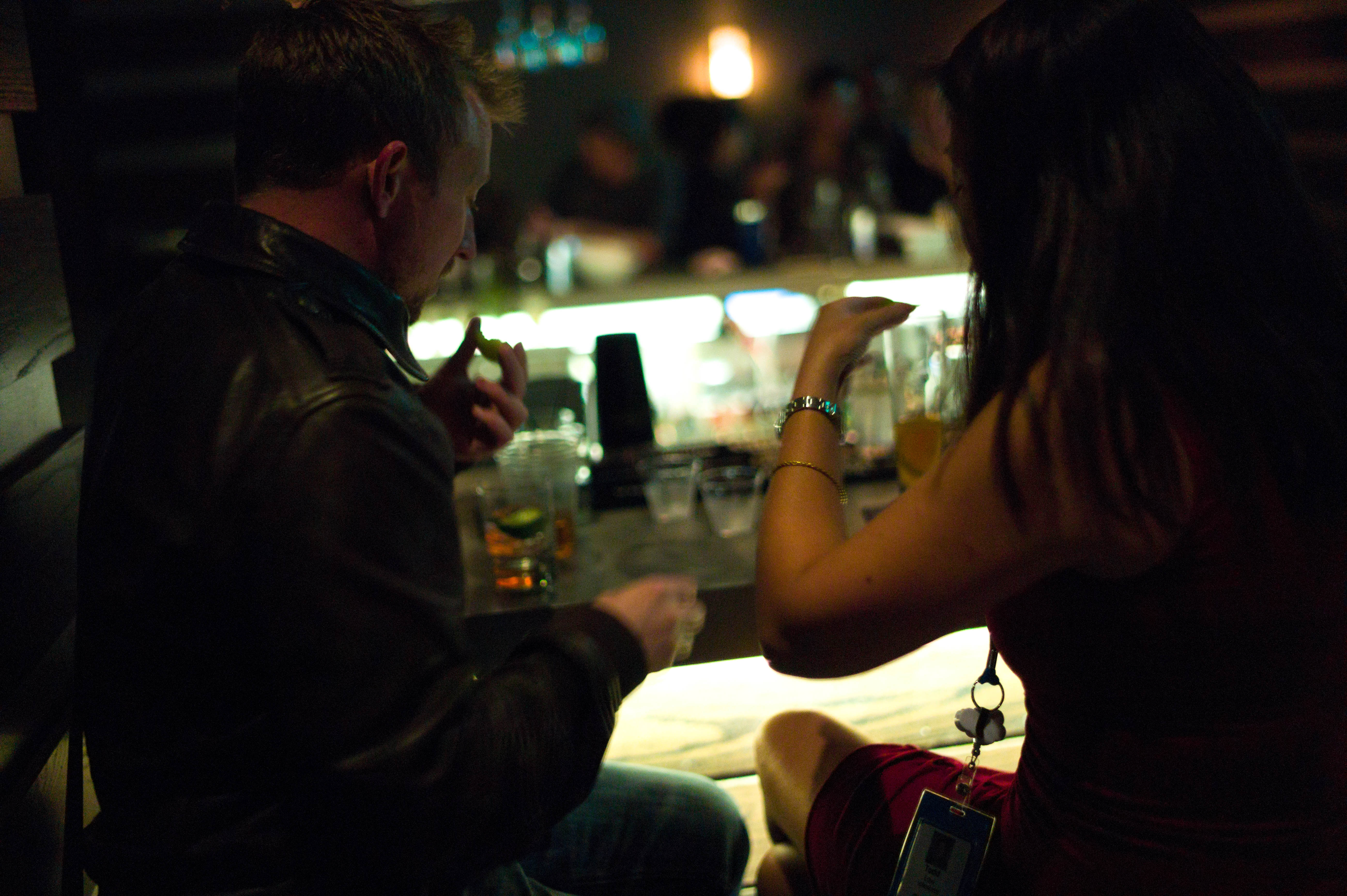 In a dimly lit bar, a man and woman share an intimate moment, their bodies angled towards each other as they engage in quiet conversation. The warm glow from the bar illuminates the scene, enhancing a sense of secrecy and allure, while shadows create an intimate atmosphere. The juxtaposition of their relaxed postures against the bustling background hints at a connection that transcends the noise around them.