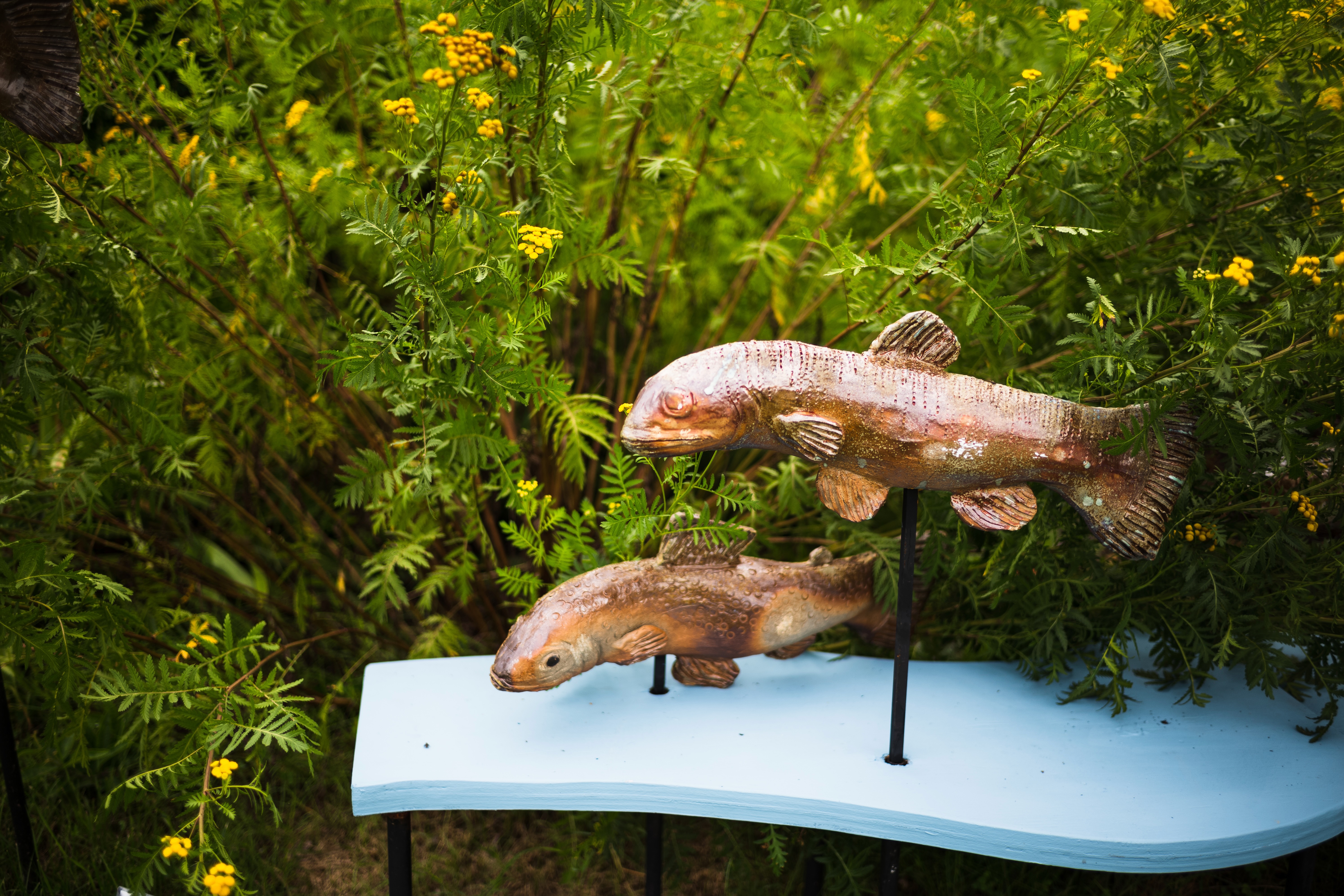 Amidst lush greenery and vibrant yellow flowers, two sculpted fish rest elegantly on a blue display stand. The interplay of natural light accentuates the texture of the sculptures, evoking a serene, whimsical mood. This composition marries nature with art, drawing the viewer's eye to the harmonious blend of colors and forms.