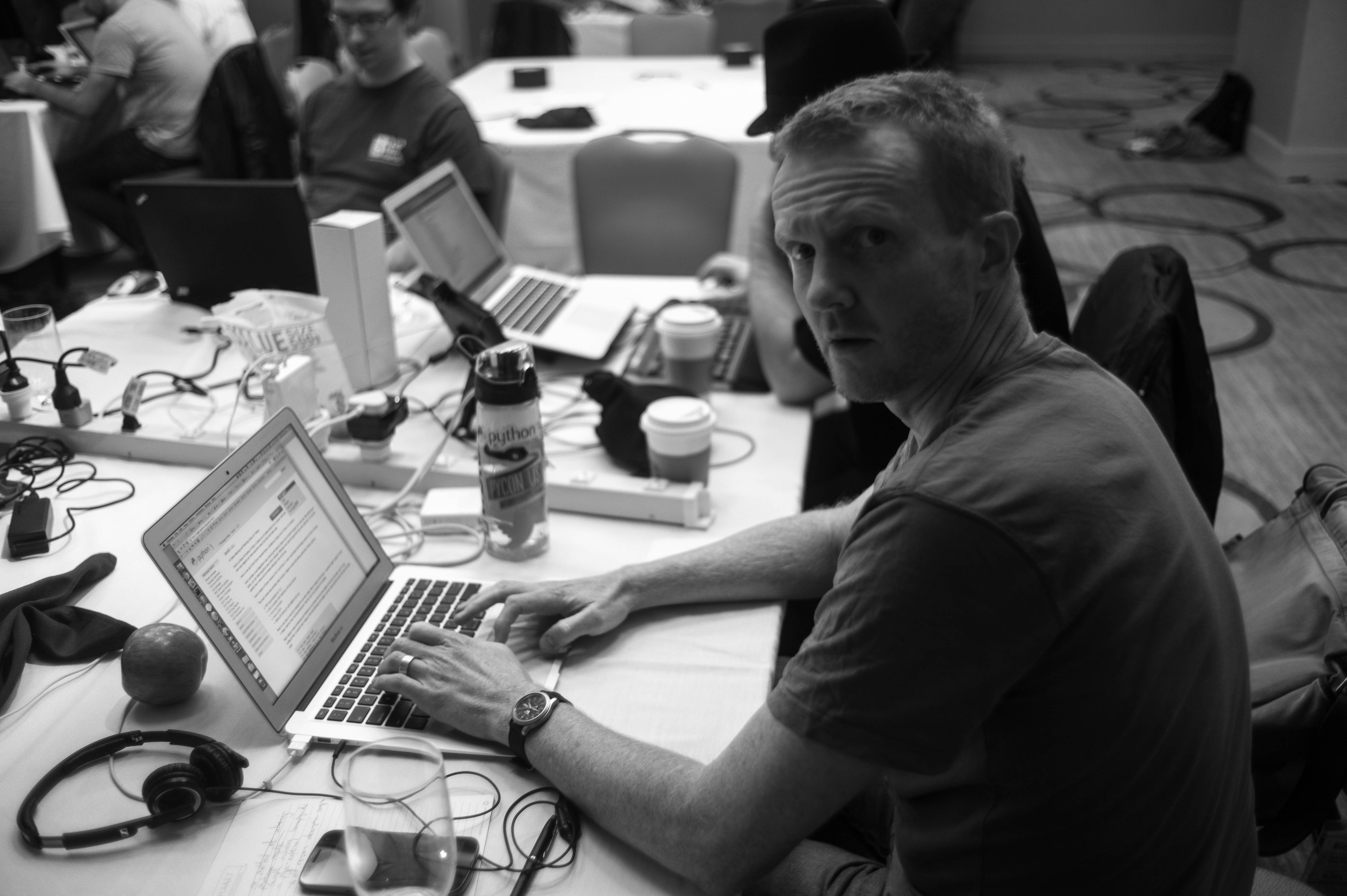 This black-and-white photograph captures a moment of concentration, with a man intently working on his laptop amid a bustling environment. The contrast of light and shadow emphasizes his expression of focus, while various gadgets and drinks clutter the table, hinting at a creative and dynamic workspace. The overall mood is one of urgency and collaboration, framed by the soft background of other engaged individuals.