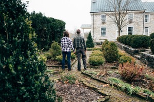 A couple stands hand in hand, their backs turned toward the viewer as they gaze into a serene garden space. The muted, overcast sky casts a soft, diffused light, enhancing the peaceful, contemplative mood of the scene, surrounded by neatly trimmed hedges and rustic pathways. The arrangement of greenery and the distant stone house creates a sense of intimacy and connection with nature.