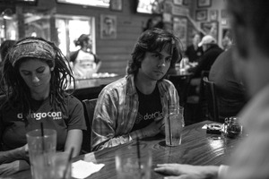 In a dimly lit bar, two figures sit opposite each other, captured in a contemplative moment. The soft black and white tones accentuate the introspective mood, with the focused gaze of the man contrasting with the woman's absorbed demeanor. Reflections and shadows within the space create a cozy yet slightly disconnected atmosphere, inviting viewers to ponder the unseen dialogue occurring just beyond the frame.
