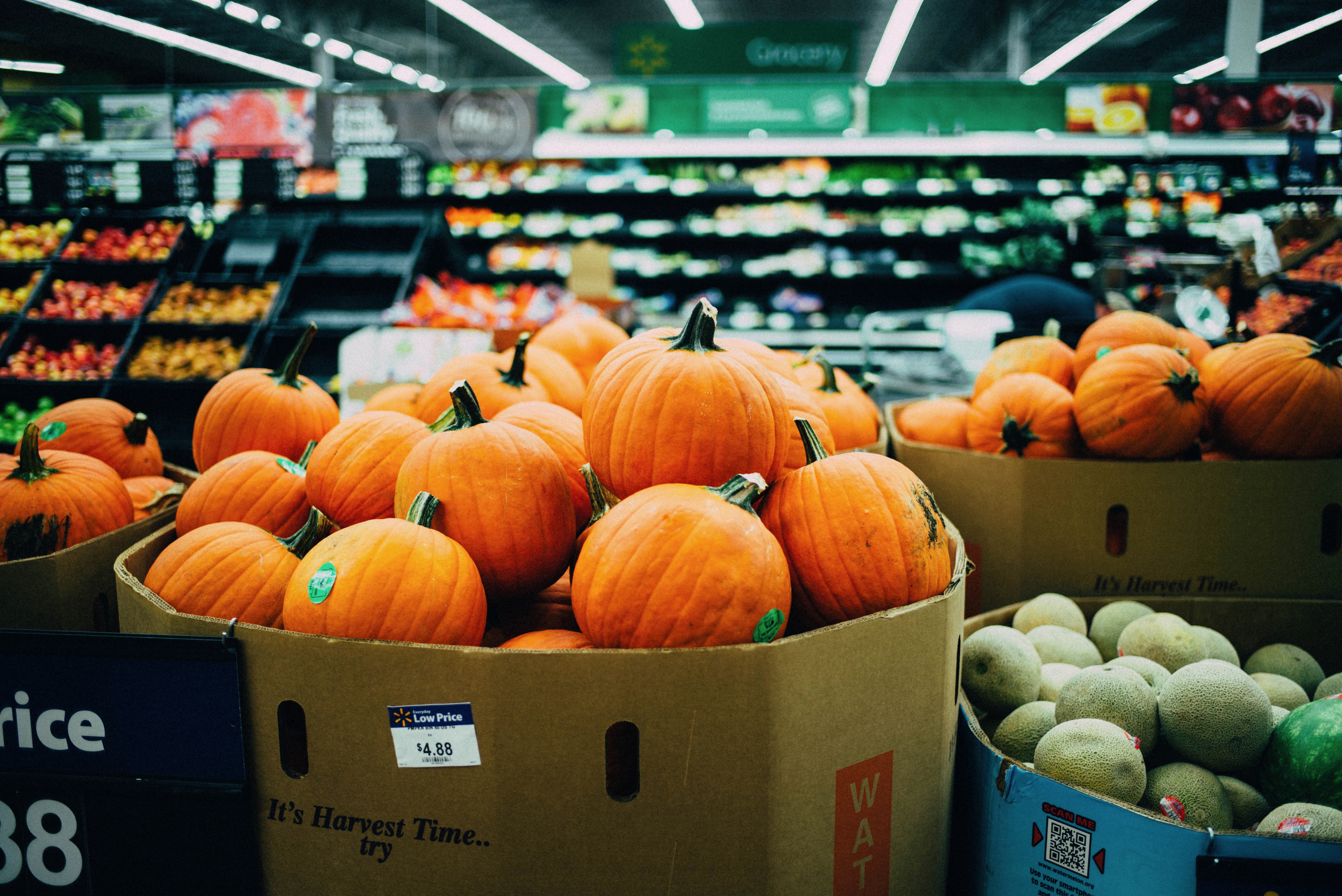 A vibrant display of pumpkins occupies the foreground, exuding a warm, inviting feel synonymous with fall harvests. Direct overhead lighting casts soft shadows, enhancing the rich orange hues of the pumpkins while contrasting against the cooler tones of melons in the background. The composition draws the viewer's eye through layers of produce, creating a sense of abundance and seasonal cheer.