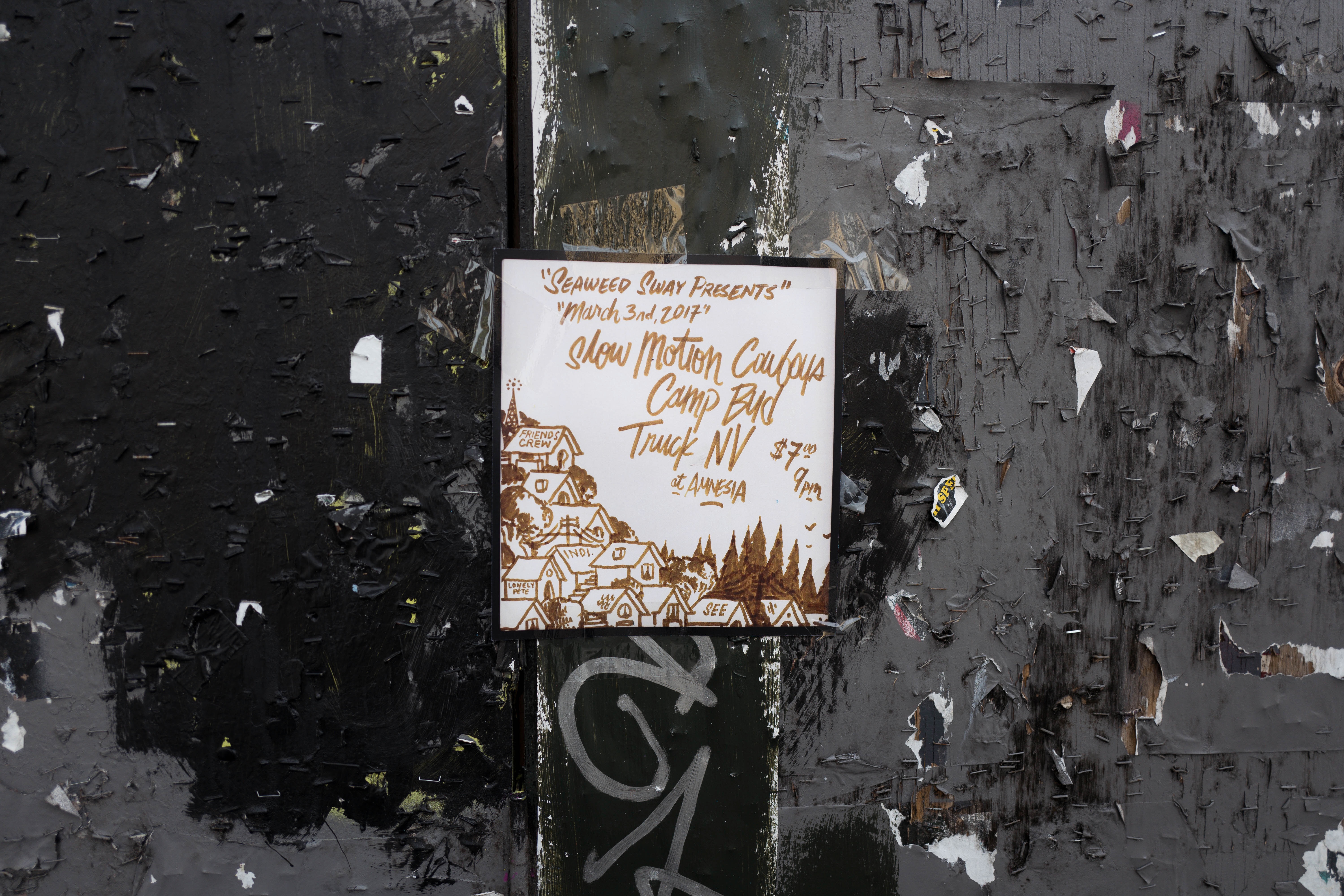 The photograph captures a weathered poster affixed to a textured black wall, showcasing an event titled "Seaweed Sway Presents". The mood is gritty and urban, as the peeling paint and rough surface contrast with the simple illustration of mountains and houses on the poster, illuminated by soft, diffused light that hints at the passage of time.