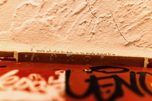 The photograph captures a close-up view of an inscription on a textured wall, where the poignant words evoke a contemplative mood. Soft lighting accentuates the grain of the wall and the rusted edges of a nearby object, creating a contrast between the harsh reality of mortality and the gentle invitation to reflect. This intimate composition invites the viewer to pause and ponder the profound message hidden in an ordinary space.