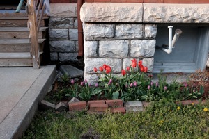 A vibrant patch of red and purple tulips springs to life at the base of a sturdy stone foundation, contrasting against the muted tones of the surrounding architecture. The soft afternoon light casts gentle shadows, inviting a sense of tranquility and warmth. Weathered bricks and wooden steps frame the scene, celebrating the interplay between nature and the man-made environment.