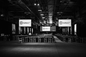 The photograph captures a spacious conference hall set for TwilioCon 2012, filled with empty rows of chairs under stark lighting. A sense of quiet anticipation pervades the scene, highlighted by the contrasting black and white tones that evoke a somber, yet professional atmosphere. Large displays at the front hint at the upcoming event, while the shadows cast by the overhead lights add depth to the composition.