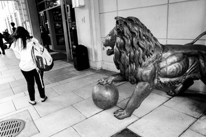 A bronze lion statue rests elegantly on the sidewalk, its fierce gaze contrasting with the casual stride of a passerby. The monochromatic tones enhance the mood of quiet strength, while the interplay of light adds depth to the lion's detailed features. This moment captures an intersection of art and everyday life, evoking a sense of both protection and transience.